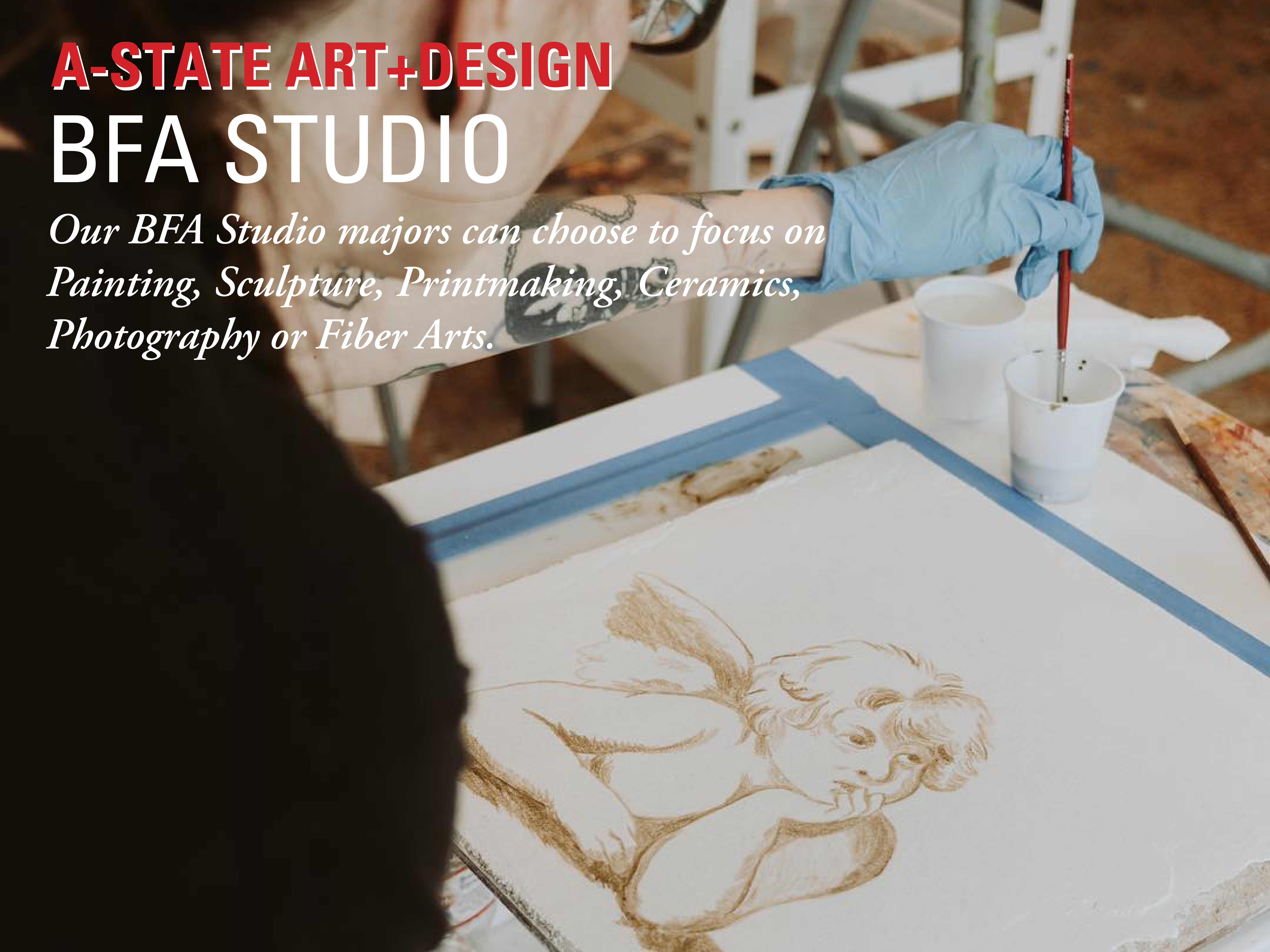 The Department of Art + Design is a dynamic multidisciplinary community for those serious about creative practice, teaching, and research. With a grounding in both tradition and contemporary culture, our faculty and students work across a diverse range of media, including photography, graphic design, fibers, printmaking, ceramics, art history, painting, metalsmithing, sculpture, game design, and VR. Throughout their time in our department, students learn technical skills, new technologies, and design processes from professionally active faculty.
